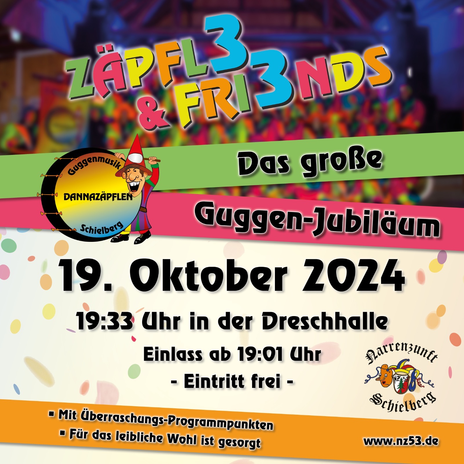 Kommt am 19.10.2024 zu uns in die Schielberger Dreschhalle um bei unserem großen Guggenjubiläum dabei zu sein 😉