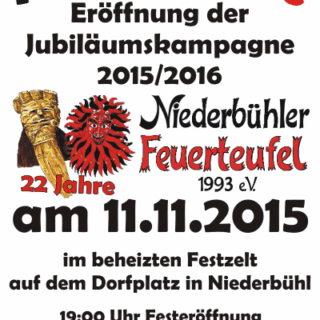 Feuertaufe der Niederbühler Feuerteufel Am 11.11.2015 ist es wieder soweit: Die Niederbühler Feuerteufel 1993 e.V. starten mit ihrer traditionellen Feuertaufe in die 22ste Kampagne 2015/2016. Der Festbetrieb im beheizten Festzelt beginnt um 19:00 Uhr....
