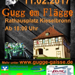 Gugg em Flägge: Am 11.02.2017 findet die legendäre Veranstaltung der Guggegaisse am Rathaus in Kieselbronn statt. In der Zeit zwischen 18 – 22 Uhr werden verschiedene Guggenmusiken und Hexengruppen auf der Bühne ihr Bestes geben...